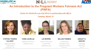 The newly passed workers’ rights bill, The Pregnant Workers Fairness Act (PWFA), establishes clear requirements for employers to offer the workplace changes pregnant employees need so they can continue working while maintaining a healthy pregnancy. In order to equip attorneys with the knowledge and resources they need to leverage the PWFA in securing accommodations for their clients, WorkLife Law is proud to offer a webinar series in partnership with the ACLU and the National Employment Lawyers Association (NELA).