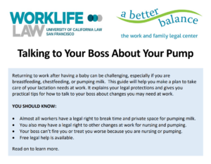 Following the historic passage of The Providing Urgent Maternal Protections (“PUMP”) for Nursing Mothers Act and the Pregnant Workers Fairness Act, WorkLife Law attorneys and advocates are working hard to ensure these new protections actually support the people who so urgently need them. For us, this means educating workers about their rights and supporting their self-advocacy. In partnership with A Better Balance, WorkLife Law created an updated English and Spanish guide for breastfeeding, chestfeeding, and pumping workers who are advocating for their lactation-health needs at work.
