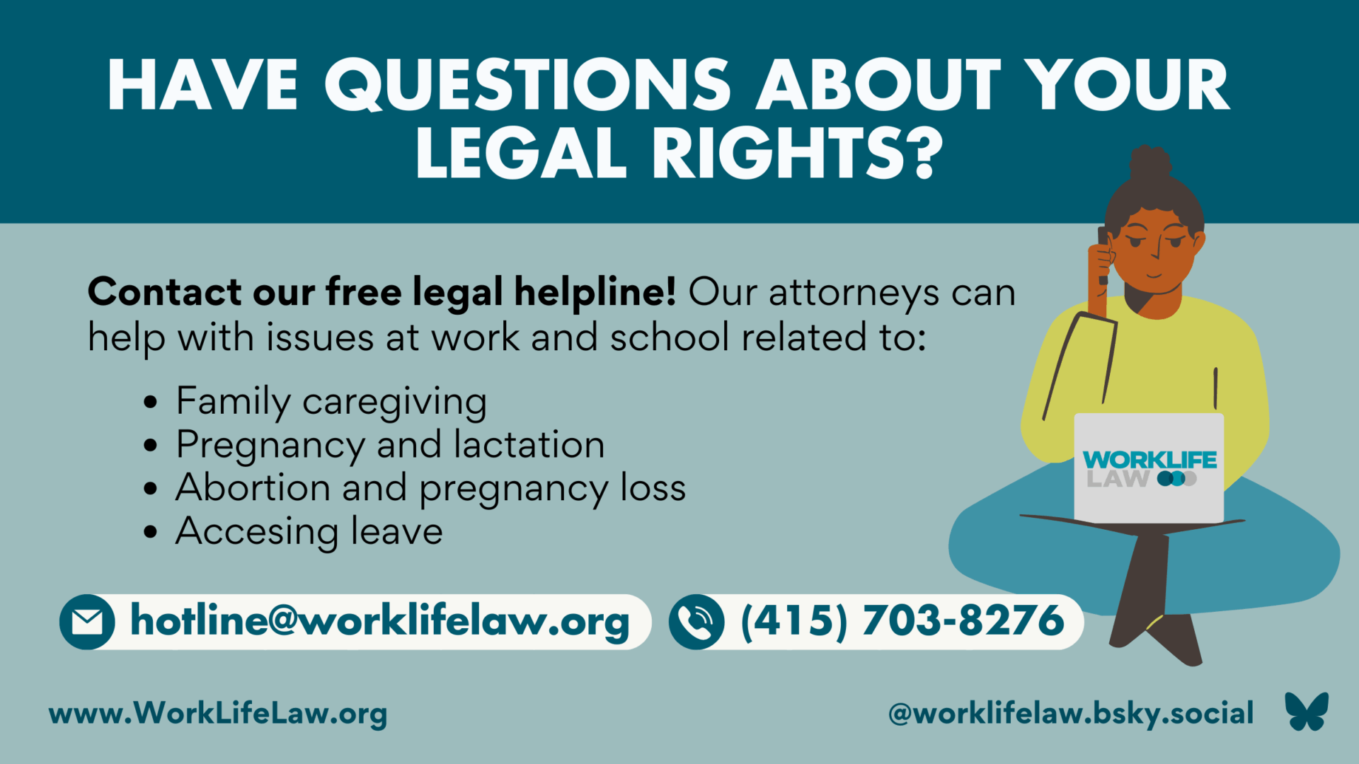Or if you prefer, you can email (hotline@worklifelaw.org) or call (415-703-8276). When leaving a voicemail, please include your name and phone number.