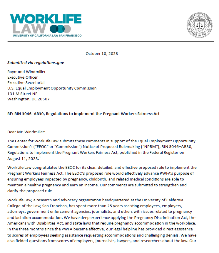 WorkLife Law’s own comment is grounded in the lessons we’ve learned through assisting the scores of workers who have called our free legal helpline since the new law went into effect seeking accommodations to stay healthy and support their families. Our comments are informed by their real world experiences and center the needs of low-wage and BIPOC workers in the most physically demanding jobs. WorkLife Law is proud to engage in continued legal advocacy that ensures the Pregnant Workers Fairness Act lives up to its promise for the most at-risk workers and their families.